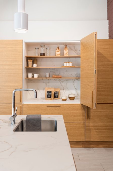 Sisään kääntyvät ovet aamiaiskaapissa maksimoivat työskentelytilan, mutta vievät extratilaa kaapin sivuilta.