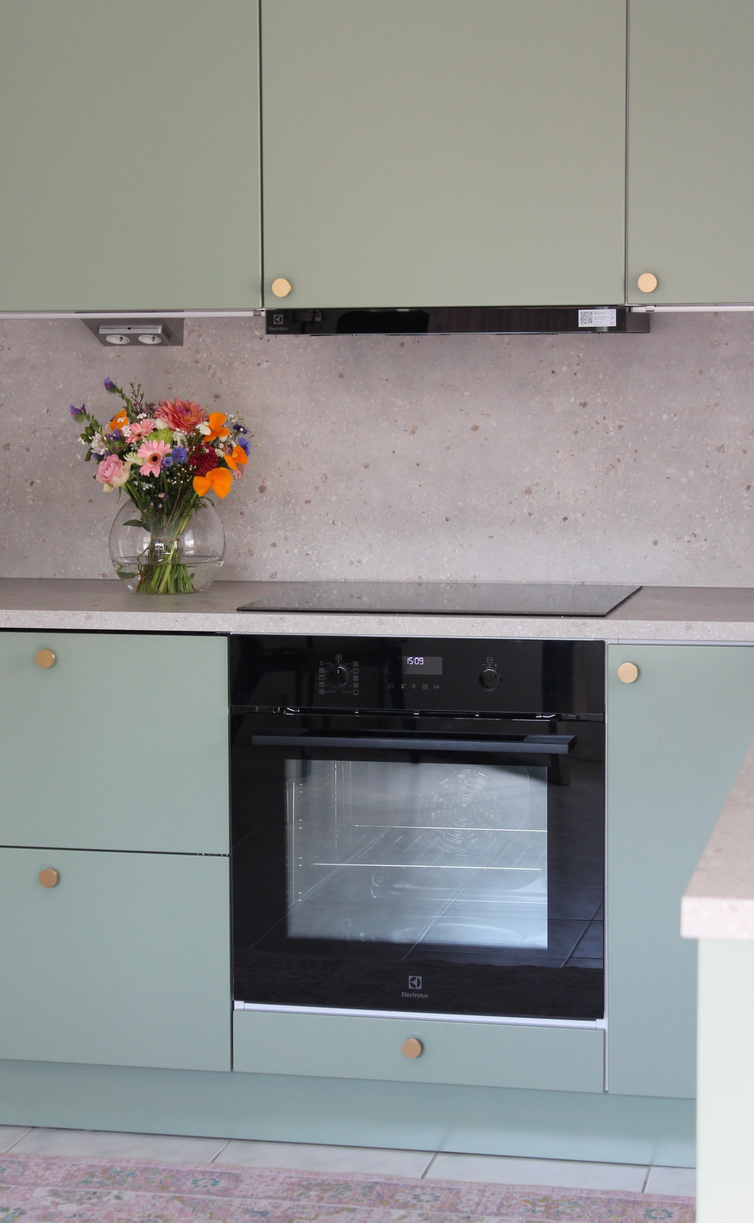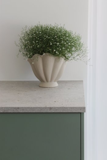 Vihreä Silo -keittiö yhdistää luonnollisen rauhallisuuden ja modernin tyylin. Vihreä ovi tuo tilaan pehmeää vehreyttä, kun taas beige terrazzo -taso lisää lämpöä ja elävää tekstuuria. Yhdessä ne luovat harmonisen ja kauniin kokonaisuuden.