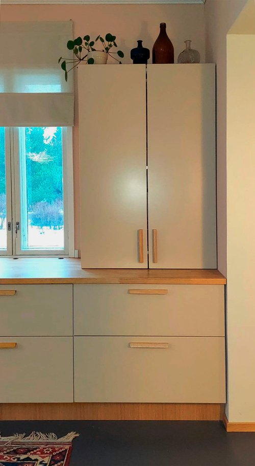 Aluksi haaveenani oli saada puusepän meille räätälöimä keittiö. Budjettimme oli kuitenkin rajallinen, joten lähdin kartoittamaan vaihtoehtoja myös muilta toimittajilta. Ideal Keittiöiden kanssa pääsimme heti hyvään yhteisymmärrykseen, ja myyjä Mari Nevala auttoi hiomaan suunnitelmistamme upean kokonaisuuden. Yllättävää minulle oli, kuinka saimme valmiilla kalusteratkaisuilla mittatilauskeittiön tuntua. Toki joitakin osia, kuten avohyllyt ja aamiaiskaapin, todella teimmekin mittojen mukaan levytavarasta.